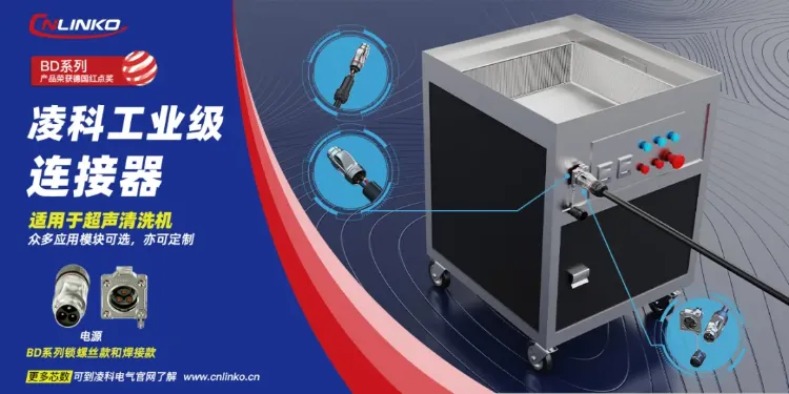 超聲波清洗機(jī)的超聲波發(fā)生器需要穩(wěn)定可靠的電源輸入來提供運(yùn)行的電能。在凌科的超聲波清洗機(jī)連接方案中,BD系列三芯工業(yè)連接器為之提供電源連接支持。