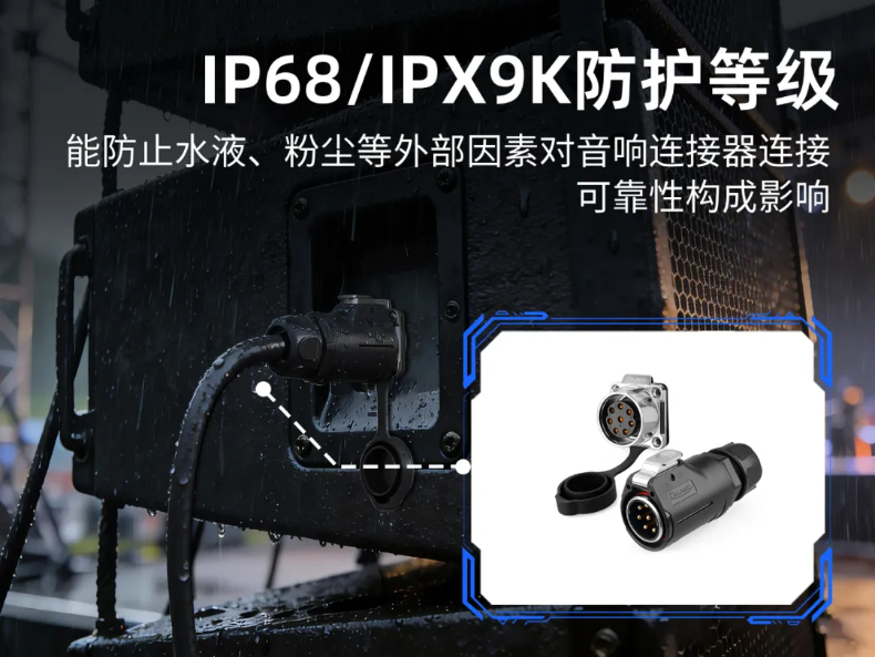 凌科這款LP28系列工業(yè)連接器擁有IP68/IPX9K級防水性能,能起到更強(qiáng)大的周密防護(hù)。對于常處于戶外環(huán)境下使用的音響系統(tǒng)而言,能更好保障長期使用的安全與可靠性。