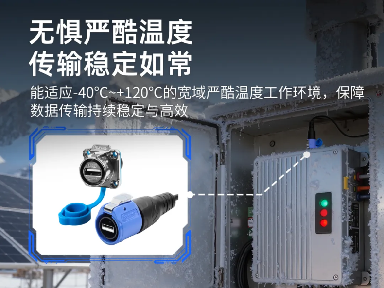 凌科LP20系列工業(yè)級(jí)防水USB連接器,其全金屬插座與配套塑膠插頭均可承受高達(dá)-40℃~+120℃的嚴(yán)酷溫度,有效抵御工控機(jī)內(nèi)部熱輻射與外部高溫環(huán)境,確保在持續(xù)高溫下性能穩(wěn)定、不降額。同時(shí)還能抵御嚴(yán)寒天氣的影響。